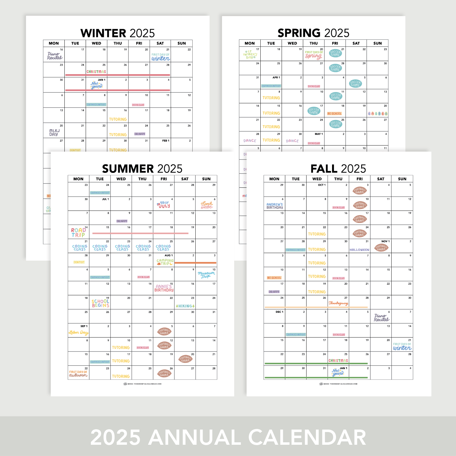 Welcome to a year of organized schedules with our 2025 Annual Calendar! 🎉 Designed to help you navigate the happy chaos of family life, this essential tool keeps you ahead of the game, three months at a time.