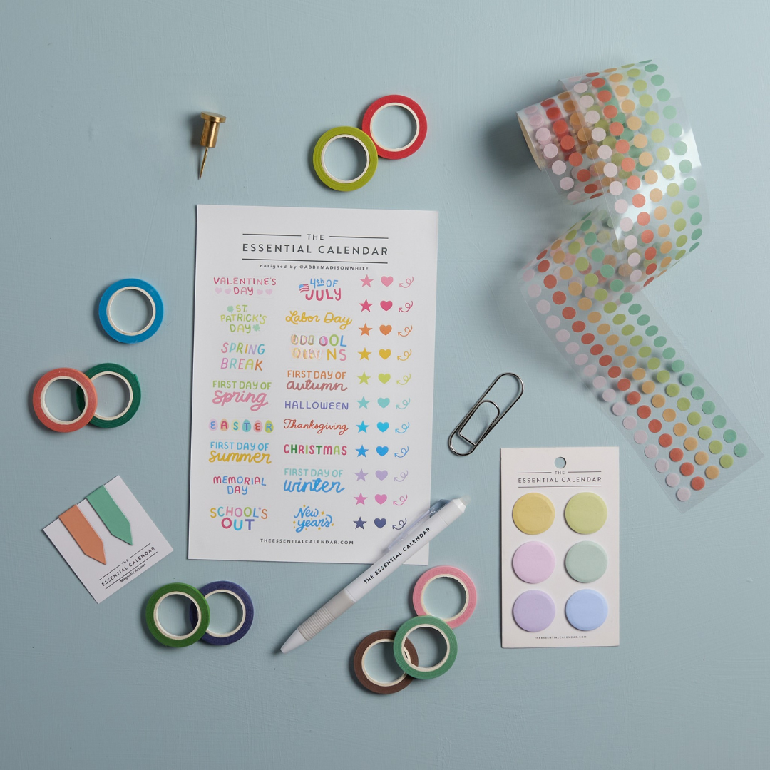 Sticker Sheet: Infuse your calendar with fun and color using our sticker sheet. Perfect for marking holidays or adding emphasis to your celebrations. Each sticker is carefully sized to fit within The Essential Calendar squares.
